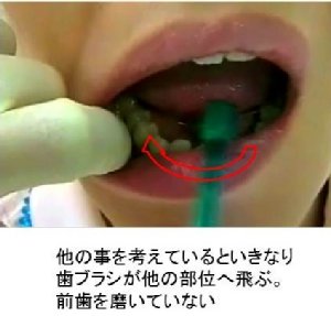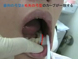 せっかく歯列と歯ブラシの毛列が合っていても、このように長いストロークで動かすと、細かい所が全く磨けず、歯の凸面ばかり並んでこすれるだけになったり、歯の根元が削れてしみてきたりします。