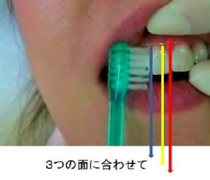 歯の形は立体的です。歯ブラシの毛先が歯面に直角に当らないと効率よく磨けません。歯を縦に3つの面に割けて磨きましょう。立てて磨いていくにあたって、正面だけではなく、左右の角度の面にも合わせてゆきます。3つの面に分かれる感覚で磨いてゆきましょう。