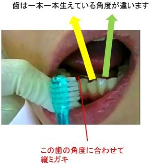 歯は一本一本生えている角度が違います。鏡を見てはの角度に合わせて磨きましょう。重なってる前歯を縦磨きする時は、鏡を見て直立方向に合わせて角度をつけましょう。