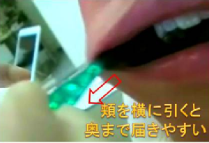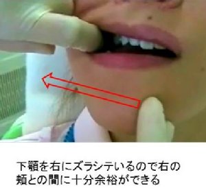 奥歯を磨くときは、口を大きく開けずに半開きにし、磨く方へ下顎を動かして隙間をつくる。上の頬側面の磨き方。顎を作業側にズラス事によって、ヘッドの動くスペースが生まれます。
